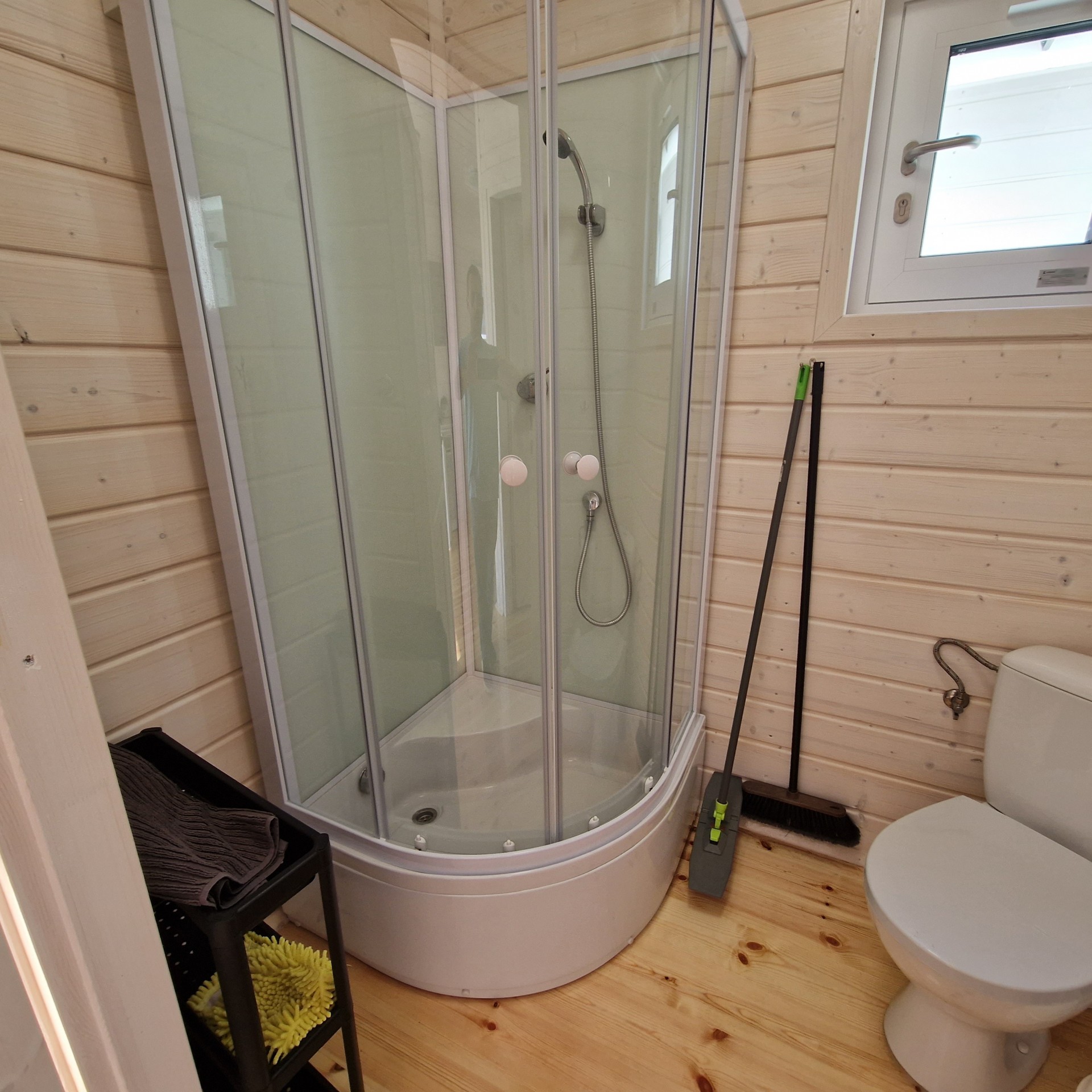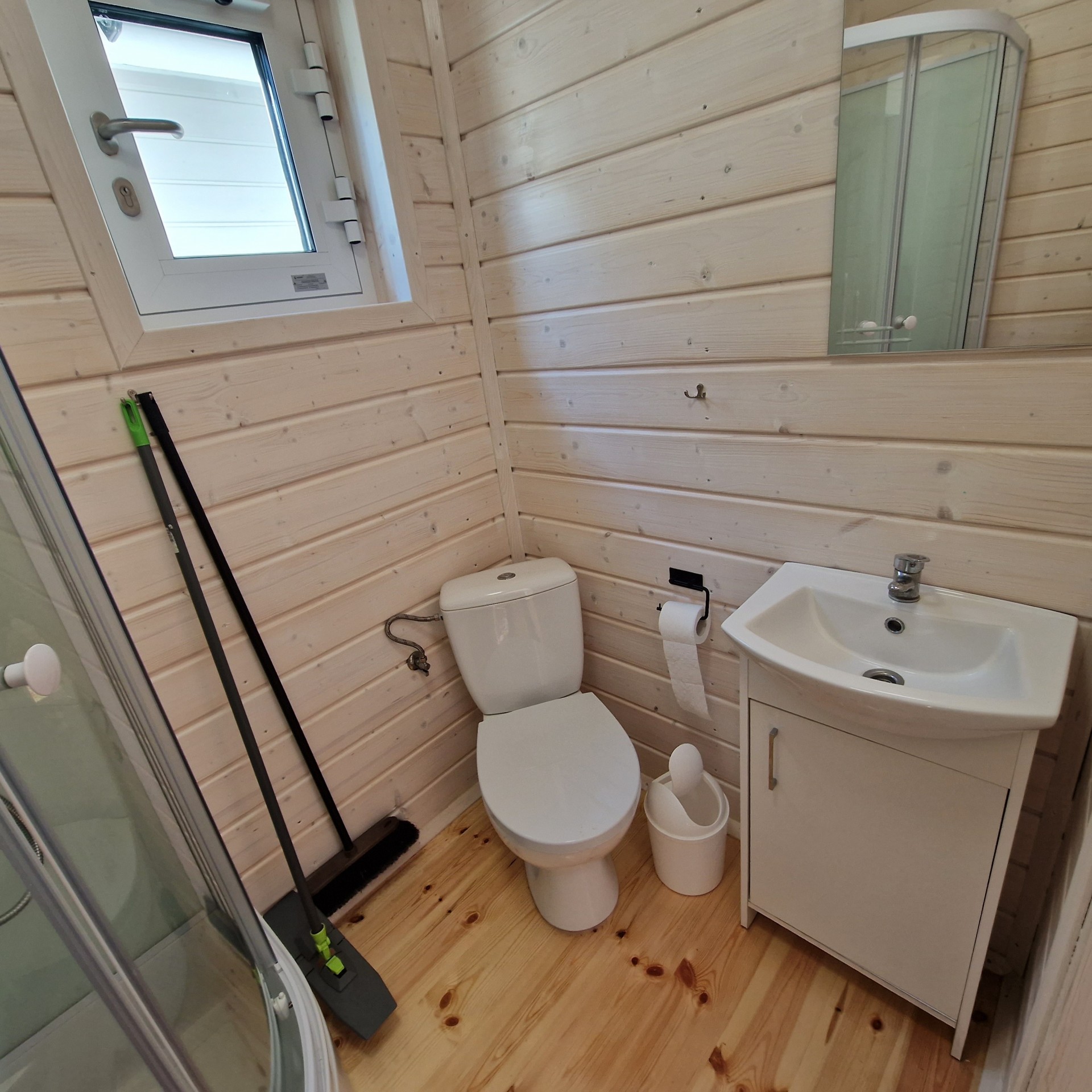 - łazienka: kabina prysznicowa, wc, szafka z umywalką