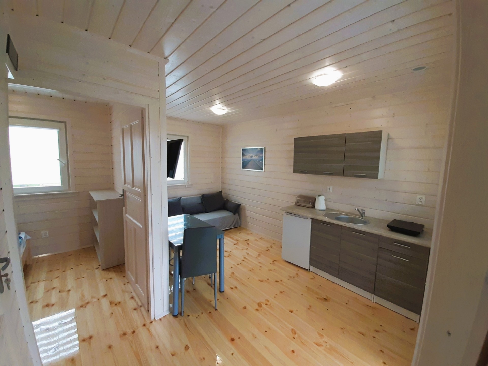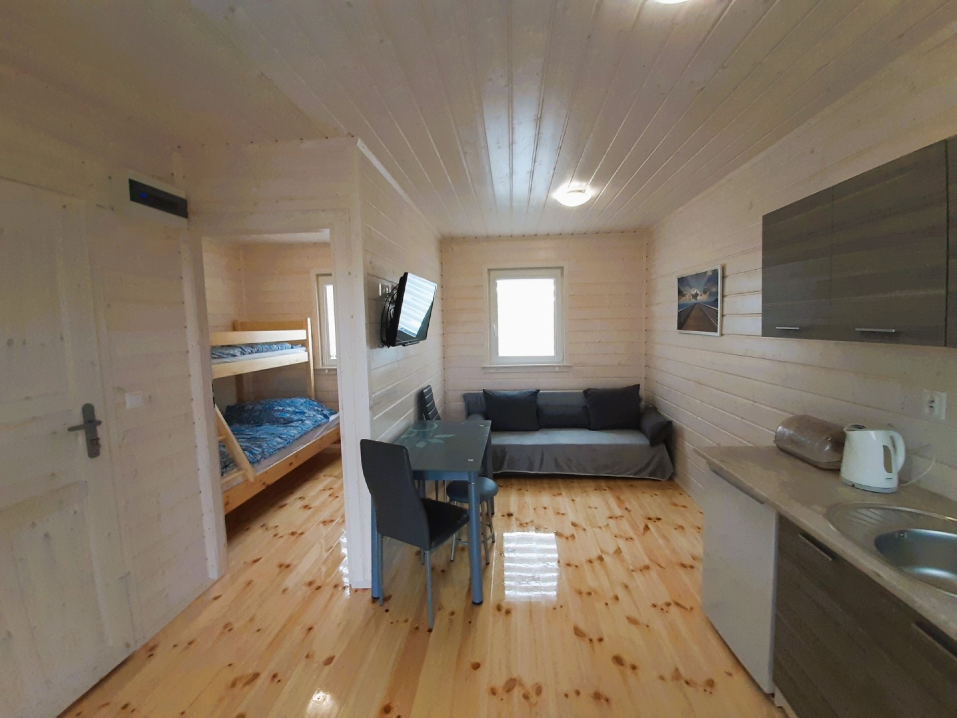Domki składają się z zadaszonego tarasu, salonu z aneksem kuchennym, dwóch sypialni i łazienki.
